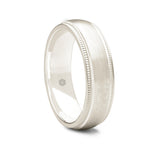 Edged with a classic millgrain pattern, the central brushed satin area is perfectly highlighted by a slim men's 9ct white gold court shaped wedding ring of highly polished metal on either side.