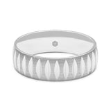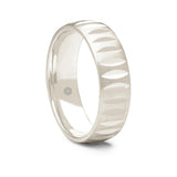 This matte finished men's 9ct white gold court shape wedding ring features a series of highly polished and hand-carved grooves around its circumference.