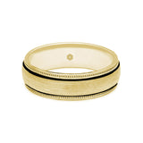 Edged with a classic millgrain pattern, the central brushed satin area is perfectly highlighted by a slim 9ct yellow gold court shaped wedding ring of highly polished metal on either side.