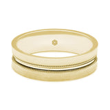 The brushed finish on this slightly concave men's 9ct yellow gold wedding ring has been given a new slant with the addition of a central polished groove bordered on either side with a classic millgrain pattern.