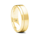This men's 9ct yellow gold flat court shape wedding ring with its comfort fit on the inside features a brushed satin surface and is finished off with the addition of an off-set, high shine groove.