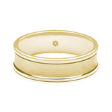 The slightly dipped centre of this men's 9ct yellow gold flat court wedding ring has a brushed satin finish bordered on either side by a subtle groove. Its highly polished outer edges complete its clean and modern look.