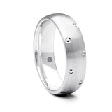 The satin finish on this mens traditional palladium 500 court shape wedding ring is given a subtle update with the addition of strategically placed diamond cut details.