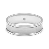 The slightly dipped centre of this mens palladium 500 flat court wedding ring has a brushed satin finish bordered on either side by a subtle groove. Its highly polished outer edges complete its clean and modern look.