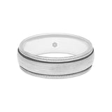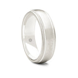 Edged with a classic millgrain pattern, the central brushed satin area is perfectly highlighted by a slim mens platinum 950 court shaped wedding ring of highly polished metal on either side.