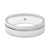 An off-set polished groove provides an eye-catching detail to the textured surface of this mens hand made 18ct white gold flat court shape wedding ring.