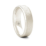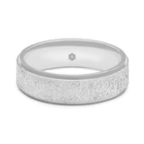 The mirror finish, diamond cut edges of this ring perfectly complement the heavily textured centre section of this mens 18ct white gold flat court shape wedding ring.