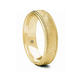 A textured central surface gives way to an elegant millgrain patterned edge. It’s highly polished outer edges lend an understated twist to this classic mens 18ct yellow gold court shaped wedding ring with a modern twist.