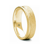 An off-set polished groove provides an eye-catching detail to the textured surface of this mens hand made 18ct yellow gold flat court shape wedding ring.