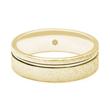 With its satin polish finish and central groove, this men’s 9ct yellow gold flat court shaped wedding ring also features eight equally spaced diamond cut accents around its surface.