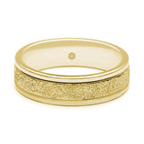 Bordered on either side by a small groove, the rough cut, central section of this men's 9ct yellow gold flat court wedding ring is then further highlighted by its highly polished edges.