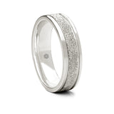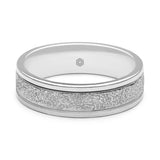Bordered on either side by a small groove, the rough cut, central section of this mens palladium 500 flat court wedding ring is then further highlighted by its highly polished edges.