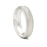 A textured central surface gives way to an elegant millgrain patterned edge. It’s highly polished outer edges lend an understated twist to this classic mens platinum 950 court shaped wedding ring with a modern twist.