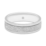 Bordered on either side by a small groove, the rough cut, central section of this mens platinum 950 flat court wedding ring is then further highlighted by its highly polished edges.