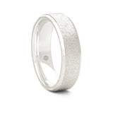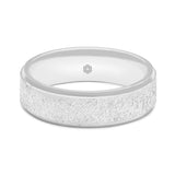 The mirror finish, diamond cut edges of this ring perfectly complement the heavily textured centre section of this mens platinum 950 flat court shape wedding ring.