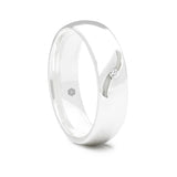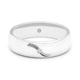 To add an eye catching feature to this highly polished, mens 9ct white gold flat court shape wedding ring a simple curved matte finished groove has been cut into the surface and set with a 0.02ct round, brilliant cut diamond.