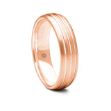 Three narrow grooves around the surface of this mens 9ct rose gold court shape wedding ring highlight its soft brushed satin finish.