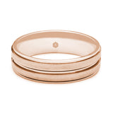 Two outer stepped grooves team up with a central stepped groove to give this mens 9ct rose gold flat court shape wedding ring two distinctly raised and satin finished surfaces.