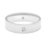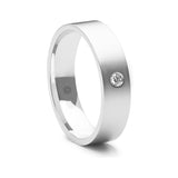 The simple and understated elegance of this mens satin finished flat court 9ct white gold wedding ring is completed with the addition of a single round, brilliant cut diamond.
