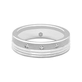 Mens Wedding Ring With a Matte Finish , Groove Pattern and Three Offset Round Brilliant Cut Diamonds