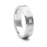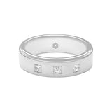 The highly polished and bevelled edge on one side of this wedding ring perfectly highlights the three princess cut diamonds set into the matte finished surface of this gents 9ct white gold wedding ring.