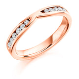 This Ladies 18ct Rose Gold Half Set Round Brilliant 0.37ct Diamond 3mm Wedding Ring is in a channel set. A channel set wedding ring has a neat edged style which allows each diamond to sit perfectly side by side. This style is traditional and should be worn next to a engagement ring with either plain shoulders or diamond channel set shoulders of the same style.