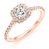 18ct Rose Gold Diamond Engagement Ring With a GIA Certified Round Brilliant Cut Centre Solitaire, Cushion Shaped Halo and Round Brilliant Cut Diamond Set Shoulders