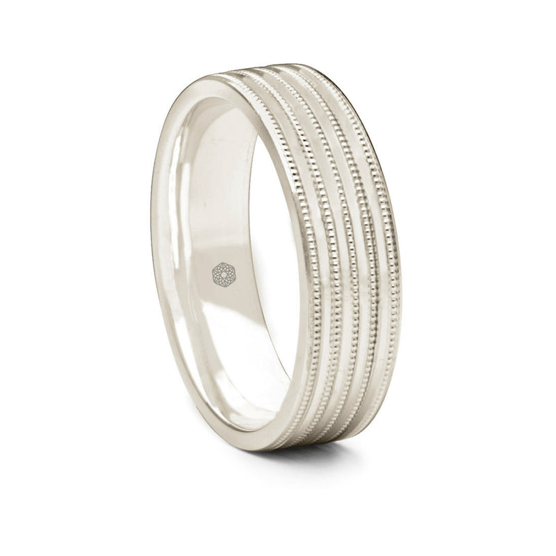 Mens Polished 18ct White Gold Flat Court Shape Wedding Ring With Grooves and Millgrain Pattern